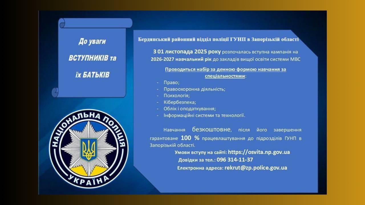 30 січня в Бердянській гімназії «Лідер» відбулася профорієнтаційна зустріч для учнів 10–11 класів із керівницею сектору кадрового забезпечення Бердянського районного відділу поліції ГУНП в Запорізькій області, майором поліції Алейніковою Оленою.