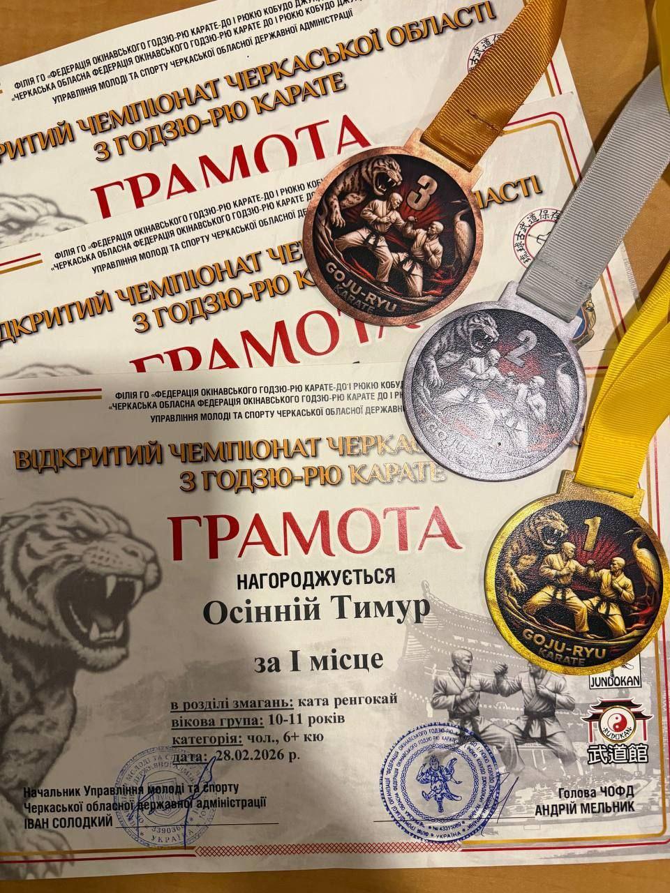 Вітаємо Тимура Осіннього, учня 6-В класу Бердянської гімназії №11, із блискучим виступом на Відкритому чемпіонаті Черкаської області з годзю-рю карате!